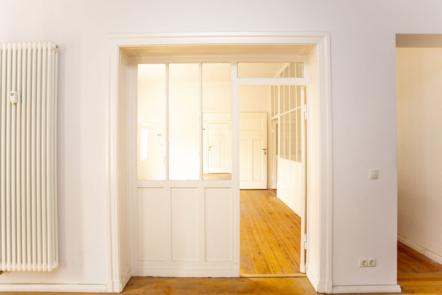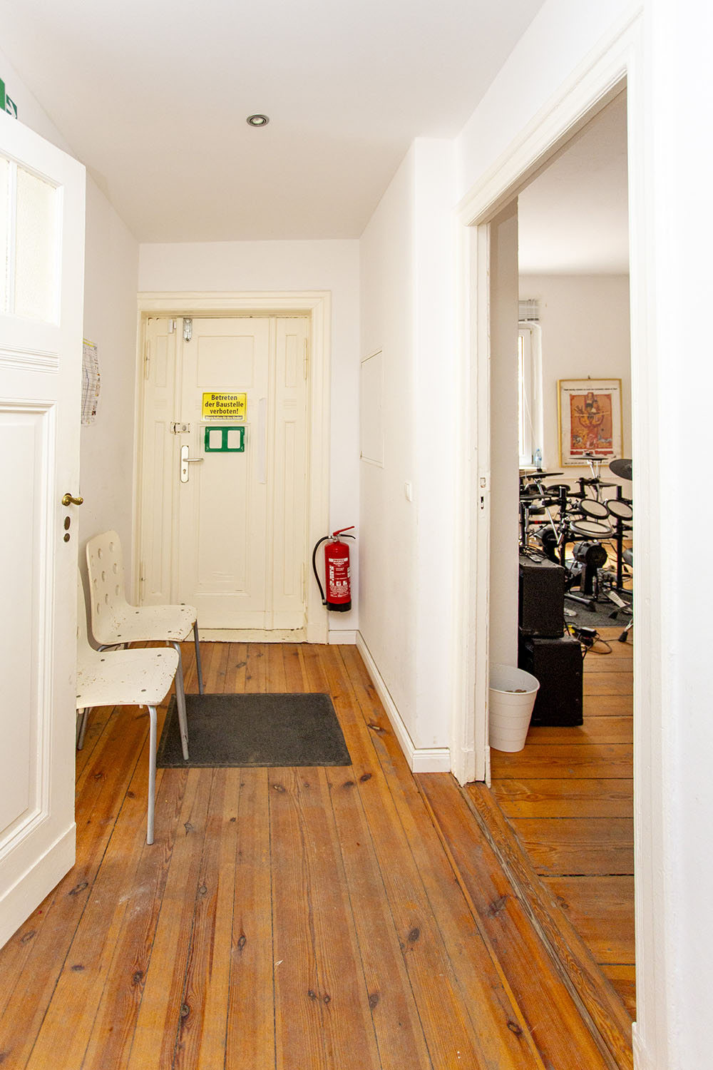 - Bodenbeläge: Holzdielen in den Arbeitsräumen, Fliesen in Küche, Flur und